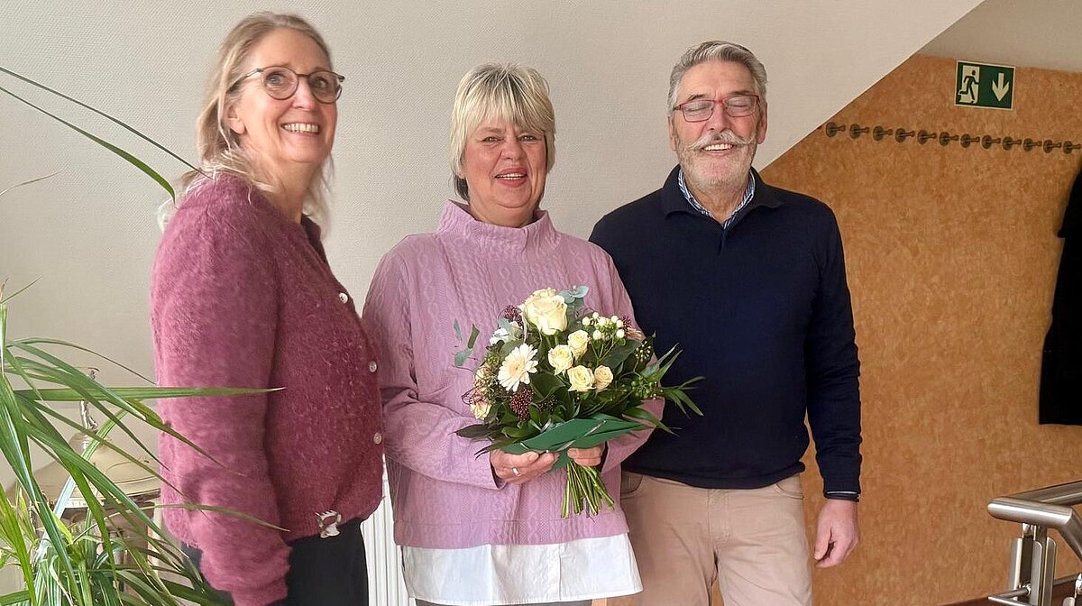 Als Anerkennung überreichten Cordula Schürmann und Thomas Degenhardt einen Strauß Blumen sowie einen kleinen Geschenkgutschein und stießen mit einem Glas Sekt an.