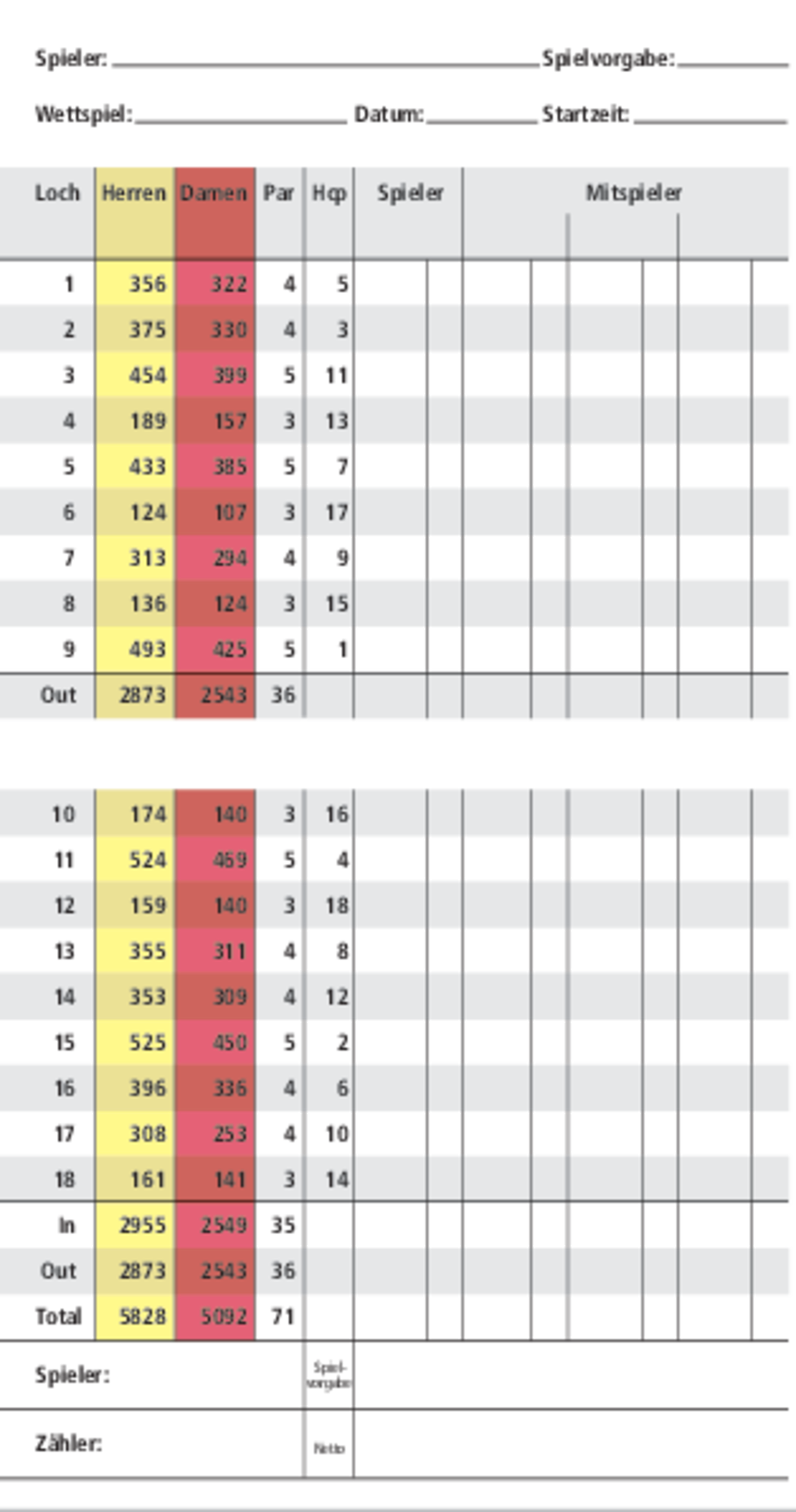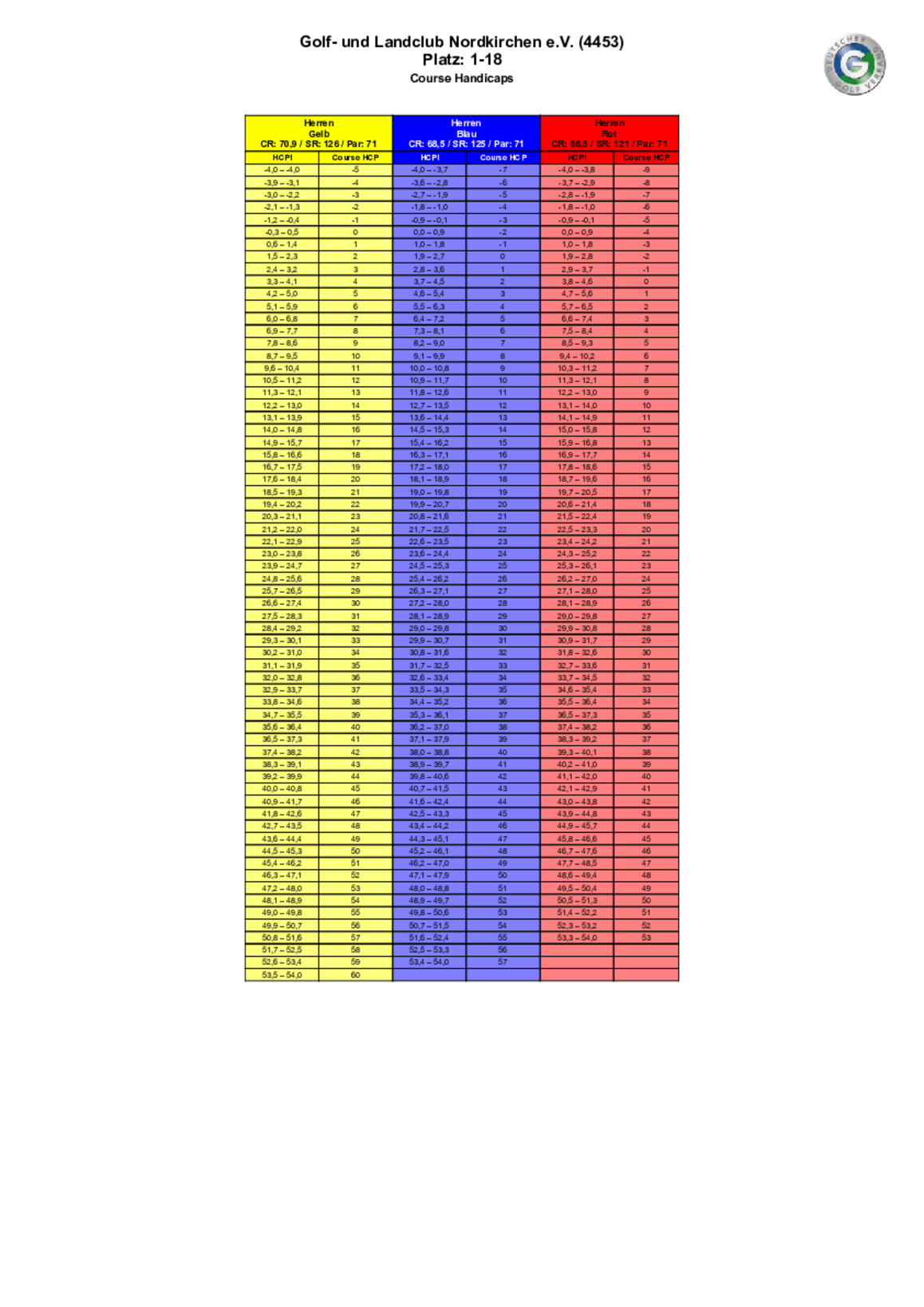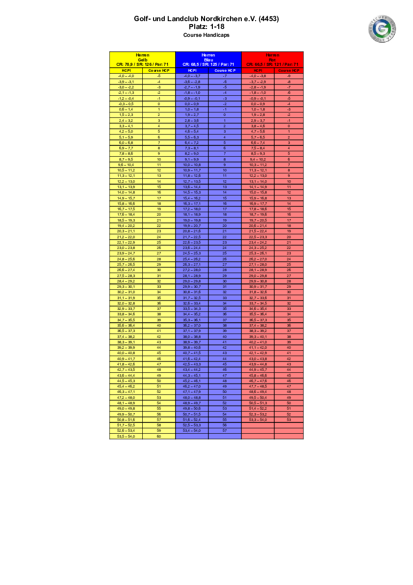 Spielvorgabentabelle 18 Loch