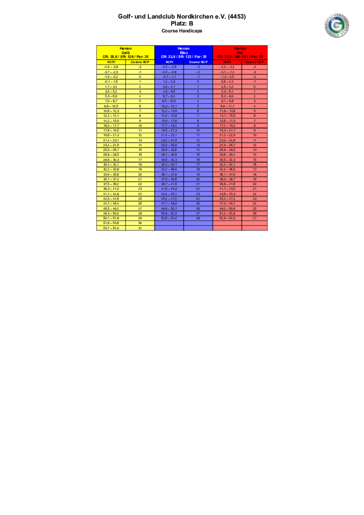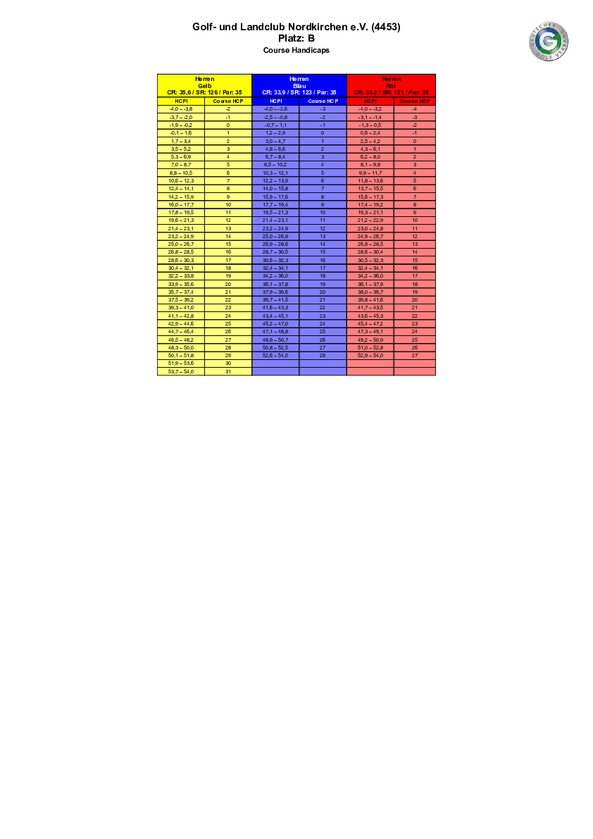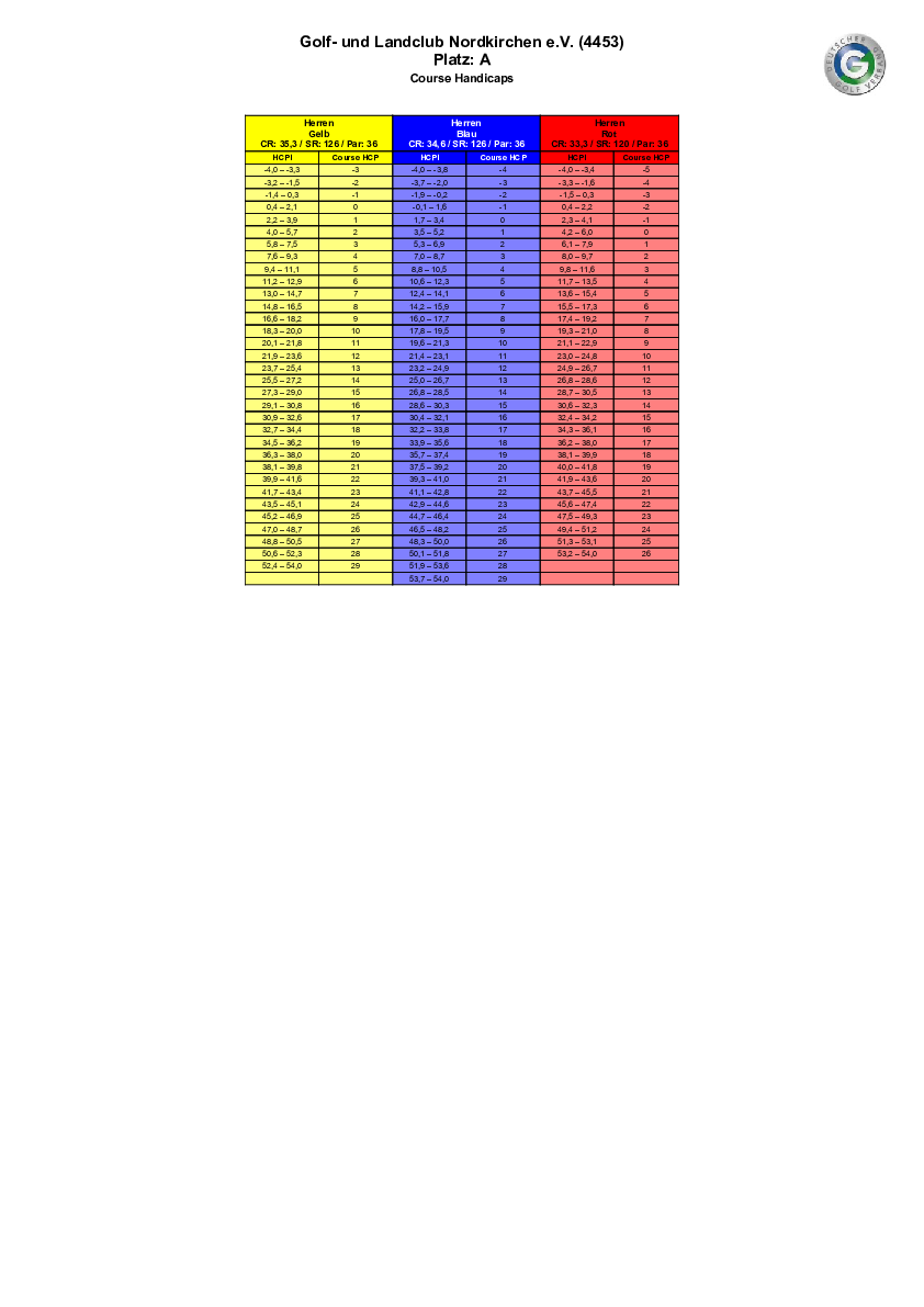 Spielvorgabentabelle 9 Loch - Bahn 1-9